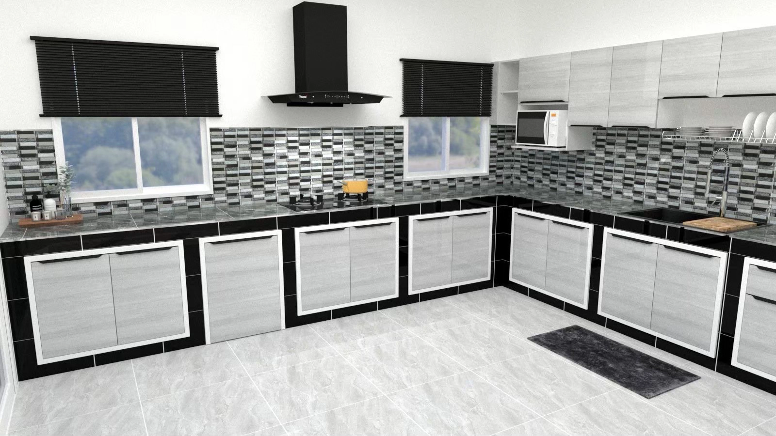 หากคุณต้องการ ห้องครัว ที่ดูหรูและทันสมัย ห้องครัวโทนดำเทาเป็นอีกหนึ่งตัวเลือกที่น่าสนใจ การใช้โทนสีดำเทา และขาวร่วมกัน ทำให้ดูมีมิติและดูหรูมากขึ้น กระเบื้องลายโมเสกหรือกระเบื้องลายหินยังช่วยเพิ่มความโดดเด่นให้กับผนังครัว ทำให้พื้นที่ดูมีดีไซน์มากขึ้น